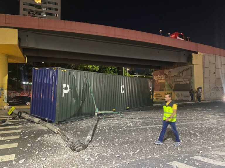 O diretor-presidente do IMMU, Paulo Henrique Martins, esteve no local do acidente e informou à Rede Amazônica que o contêiner não estava fixado no eixo da carreta. Container cai de viaduto em Manaus. Carolina Diniz, Rede Amazônica. Um container se soltou do eixo de uma carreta e caiu do viaduto Miguel Arraes, na avenida Ephigênio Salles, Zona Centro-Sul de Manaus. Veja os vídeos abaixo. Um carro que trafegava embaixo do viaduto foi atingido por pedaços de concreto da estrutura e um poste que foi destruído com a queda do contêiner. Não houve feridos no acidente. Container se solta de carreta e cai de viaduto em Manaus Segundo informações repassadas por agentes do Instituto de Mobilidade Urbana (IMMU), o motorista da carreta estava saindo da avenida Mário Ypiranga e, ao fazer a curva para entrar na avenida Ephigênio Salles, o container soltou e despencou no local. O diretor-presidente do IMMU, Paulo Henrique Martins, esteve no local do acidente e informou à Rede Amazônica que o container não estava fixado no eixo da carreta e que o motorista estava em uma velocidade incompatível com a curva, por isso a estrutura metálica tombou . Carreta fazia curva no viaduto quando conteiner despencou. Maria Eloá, da Rede Amazônica. O container foi retirado da pista com auxílio de guindaste e colocado no canteiro central da avenida, para liberação do trânsito no local. Equipes da transportadora de energia também foram acionadas para fazer a remoção do poste danificado e dos fios e cabos de energia soltos na via. A Polícia Militar acompanhou a ocorrência. Não há informações sobre os procedimentos que foram adotados em relação ao motorista da carreta. *Com informações de Carolina Diniz, da Rede Amazônica. Conteiner despencou do Viaduto Miguel Arraes, em Manaus. Maria Eloá, da Rede Amazônica. Vídeos mais assistidos do Amazonas