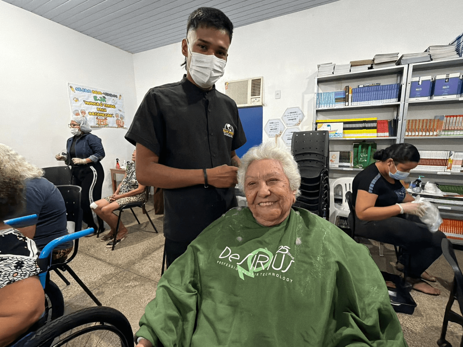 Durante a ação, as idosas receberam cuidados de beleza, como cortes de cabelo e momentos de atenção e acolhimento, proporcionando um dia dedicado ao cuidado pessoal e à valorização das residentes.