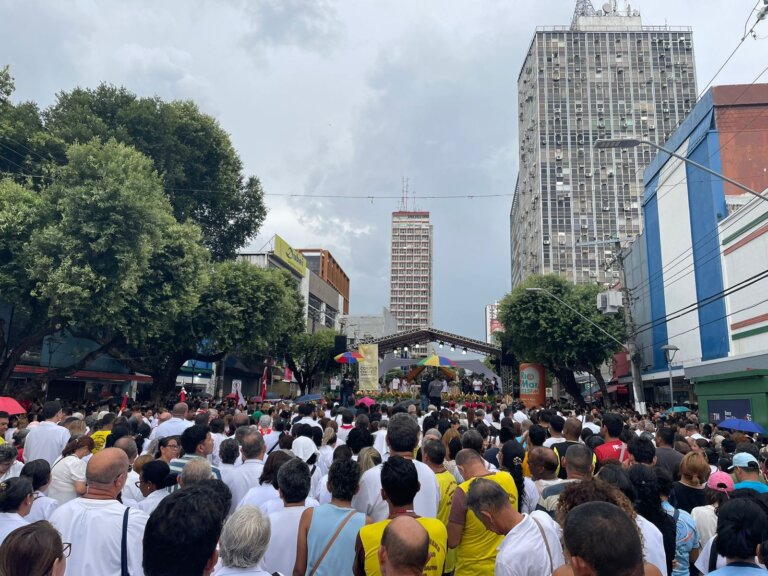 Missa solene foi presidida pelo arcebispo de Manaus, cardeal dom Leonardo Steiner, na Avenida Eduardo Ribeiro, e reuniu fiéis de todas as paróquias da capital. Missa de Corpus Christi em Manaus. Matheus Castro, g1 AM Fiéis católicos celebraram nesta quinta-feira (8) a solenidade de Corpus Christi. Em Manaus, a programação religiosa contorno com missas e a tradicional procissão pelas ruas do Centro da capital. A missa solene, realizada durante a tarde, foi presidida pelo arcebispo de Manaus, cardeal dom Leonardo Steiner, na Avenida Eduardo Ribeiro, e convocou fiéis de todas as paróquias da capital. Em sua homilia, o religioso falou sobre a importância da Eucaristia – que para os católicos é o corpo de Cristo – para a vida dos fiéis e da igreja. “O pão vivo descido do céu não é o pão de fermento, mas é a pessoa de Jesus, que nos guia, nos ilumina, é o filho de Deus que vem ao nosso encontro, sentido da nossa fé, das nossas comunidades. Quem se alimenta de Jesus tem a vida eterna”, disse o arcebispo. Procissão de Corpus Christi em Manaus Matheus Castro, g1 AM Após a missa, os fiéis saíram em procissão pelas principais ruas do Centro. Um dos momentos mais bonitos da caminhada foi a benção do Santíssimo sobre os doentes em frente ao Hospital Beneficente Portuguesa. Ao final da procissão, foi realizada uma disposição eucarística no palco na Avenida Eduardo Ribeiro. Vídeos mais assistidos do Amazonas