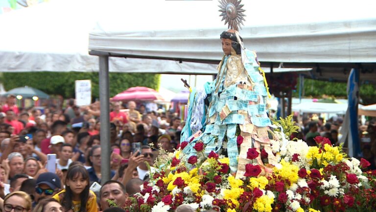 Festa atrai milhares de devotos e rio iluminado, manto de dinheiro, procissão fluvial, procissão terrestre, arraial e, claro, casamento. Procissão de Santo Antônio de Borba, no Amazonas. Alexandro Pereira/Rede Amazônica Rio iluminado, procissões com Santo Antônio com fitas de cetim coberturas de dinheiro, arraial e, claro, casamento. O padroeiro de Borba, no interior do Amazonas, recebe quase duas semanas de homenagens. A festa atrai milhares de devotos, a Rede Amazônica acompanhou cada passo da celebração religiosa. Veja mais detalhes na reportagem completa abaixo. Com 42 mil habitantes, só é possível chegar no município de avião ou barco. De longe, é possível avistar a imagem de 13 metros do padroeiro. A madrugada de 1º de junho anuncia que, ao longo dos próximos 13 dias, a cidade estará em festa. LEIA TAMBÉM: Fiéis agradecem, relatam história de fé e devoção a Santo Antônio de Borba Almofadas feitas com fitas de promessas para Santo Antônio são leiloadas por até R$ 1 mil Conheça a cidade no meio da Floresta Amazônia que homenageia Santo Antônio durante 13 dias São dias intensos de trabalho movidos pela fé. Pelas mãos dos ribeirinhos, o fruto da terra ganha um novo destino. A casca da laranja, recheada de estopa e embebida em diesel, se transforma em luminária. A procissão fluvial que se forma traz uma imagem de Santo Antônio da comunidade ribeirinha de Acará até a basílica de Borba. Quando chega a noite, os devotos ficam às escuras para fazer o Rio Madeira brilhar. “A gente não ganha nada. A gente faz isso de coração todo ano e não se arrepende nunca. Se pudesse ser mil anos, 40 mil anos, a gente sempre vai fazer, porque é para ele. É para Santo Antônio, ele merece”, conta Anderson Carril, canoeiro. Os fiéis fazem o manto de Santo Antônio com fitas de cetim decks de dinheiro. É tradição popular no município, a imagem dos padroeiros cercada por milhares de notas de reais passa pelas ruas do município, a multidão que acompanhou enxergou pelos olhos da fé que a promessa de muitos devotos foi recebida. Vídeos mais assistidos do Amazonas
