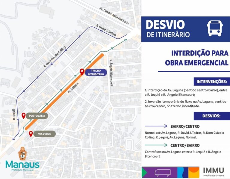 O motorista que circula na avenida Laguna no sentido bairro/Centro, é desviado para a rua David José Tadros, rua Dom Cláudio Colling, e transita pelas ruas do entorno para, posteriormente, retornar à avenida Laguna em frente a empresa de ônibus Via Verde pela rua Jequié.