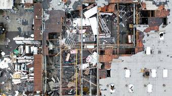 As imagens mostraram o que parecia ser parte de um telhado voando sobre edifícios industriais. Imagens aéreas registraram buracos em vários telhados, além de canos e instalações tortos ou quebrados após a passagem do tornado, além de carros arrastados de estacionamentos