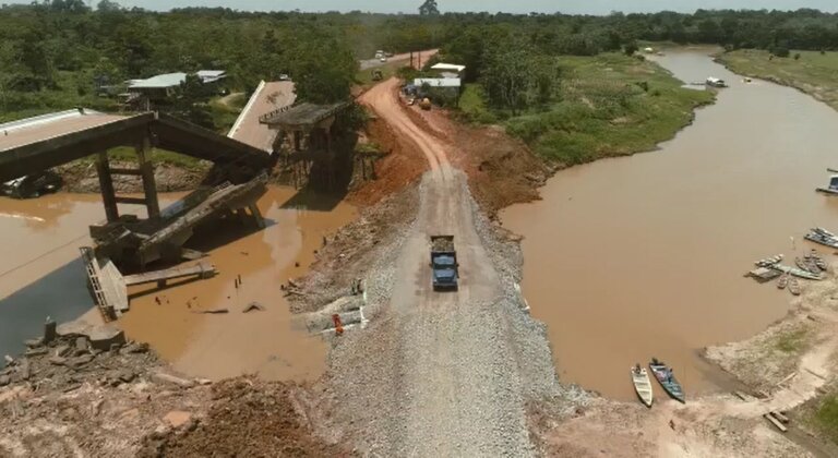 Serviço será paralisado das 13h30 às 17h30, no trecho onde uma a balsa serve como pista improvisada para a passagem de motoristas sobre o Rio Autaz Mirim, após a queda de uma ponte. Rio Autaz Mirim, BR-319, no Amazonas. Rede Amazônica O Departamento Nacional de Infraestrutura de Transportes (DNIT) informou que a operação da balsa que realiza atualmente a travessia sobre o rio Autaz-Mirim (km 24,6), na BR-319, no Amazonas, ficará temporariamente suspensa, nesta quinta -feira (4), das 13h30 às 17h30. A balsa passou a substituir uma pista improvisada para a passagem de motoristas sobre o Rio Autaz Mirim, no km 25 da BR-319, no Amazonas, onde uma ponte desabou em outubro do ano passado. Dias antes, outra ponte também desabou na região. A autarquia informou que a ação é necessária para que seja feito o reposicionamento da embarcação que realiza a travessia do Autaz-Mirim em decorrência do aumento do nível da água do rio em função da estação da cheia. Dessa maneira, a travessia passará a ser realizada pelo outro lado da ponte antiga, garantindo mais segurança na operação. Ao termo da ação, o serviço será normalizado. Queda das pontes As duas pontes desabaram na rodovia federal – a principal via de acesso terrestre do Amazonas para outras regiões do país, em um intervalo de dez dias: No dia 28 de setembro, a ponte sobre o Rio Curuça despencou, deixando quatro mortos e mais de 10 feridos. Uma pessoa segue desaparecida. Já no dia 8 de outubro, a apenas 2 milhas do local onde ocorreu o acidente, a ponte sobre o Rio Autaz Mirim desabou poucas horas após ser interditada. Ninguém ficou ferido. Vídeos mais assistidos do Amazonas